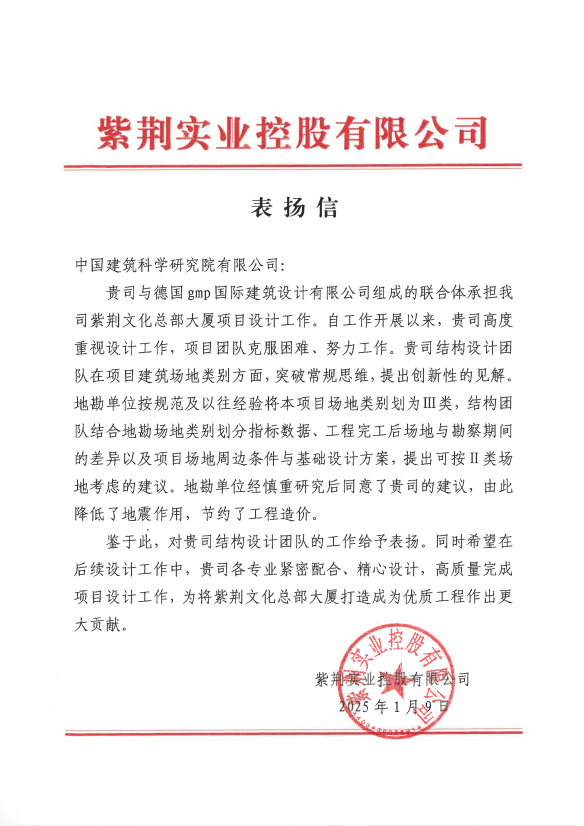 1月9日,中国建研院深圳分米乐官方版·(中国)官方网站收到紫荆实业控股有限米乐官方版·(中国)官方网站发来的表扬信,对中国建研院深圳分米乐官方版·(中国)官方网站紫荆文化总部大厦项目设计团队的工作给予充分肯定。