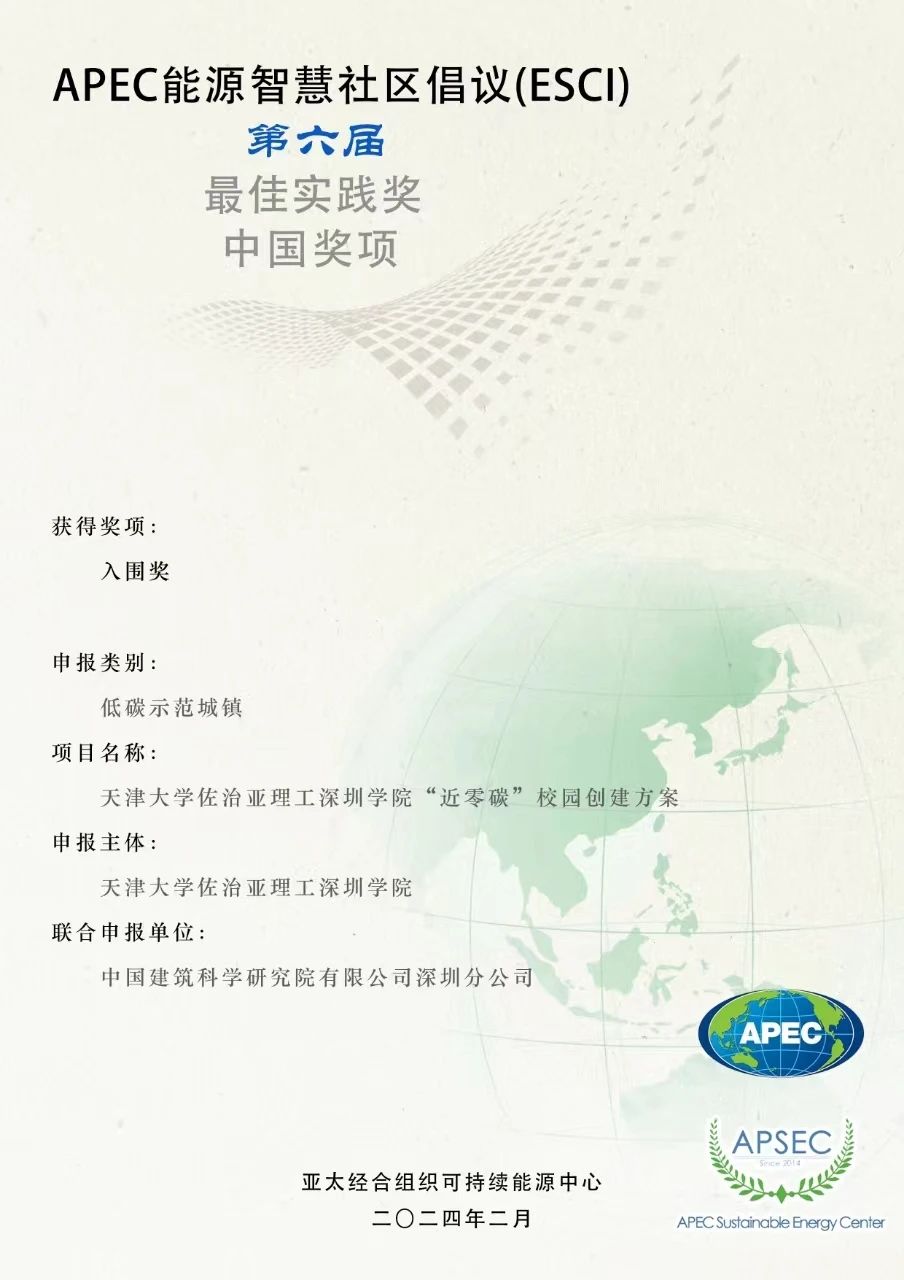 近日,由中国建研院深圳分米乐官方版·(中国)官方网站承接的“近零碳”校园咨询项目——天津大学佐治亚理工深圳学院成功获得第六届APEC能源智慧社区倡议(ESCI)最佳实践奖中国奖项“入围奖”。