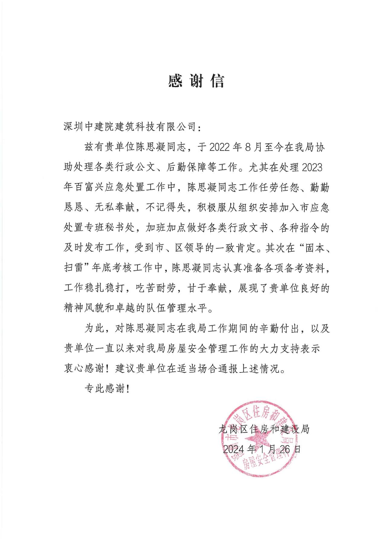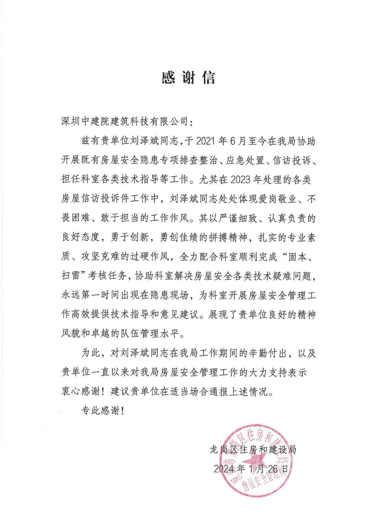 近期,深圳中建院建筑科技有限米乐官方版·(中国)官方网站(以下简称“深圳中建院”)收到深圳市龙岗区住房和建设局发来的感谢信,对深圳中建院多年来在房屋安全管理工作中的大力支持表示感谢,对刘泽斌、陈思凝两位同志的辛勤付出提出表扬。