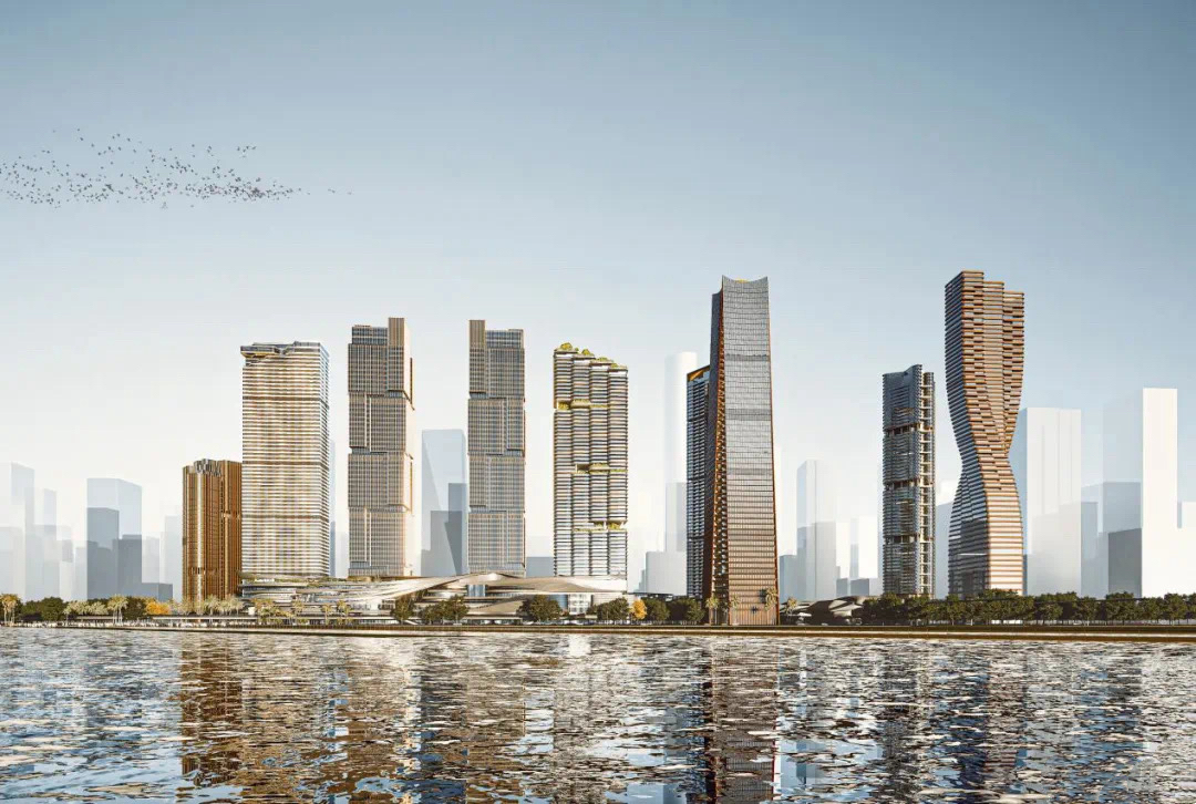 前海国际枢纽中心项目位于前海CBD桂湾片区的核心位置,作为深圳在建规模超大的枢纽TOD工程之一,用地面积达20公顷,未来将打造成集综合交通枢纽、立体商业、甲级办公、国际星级酒店、商务公寓于一体的超级枢纽城市综合体。枢纽项目上盖有9栋超高层建筑,其中T2为商务公寓,建筑高度约250米。T3和T4为双子塔超甲级写字楼,建筑高度近300米,其变化丰富的立面打造出独特的综合体建筑形象,因紧邻前海湾,T3、T4写字楼造型上还具有“水石相间”的含义,两栋对称的塔楼将成为该项目的亮点封面之一。