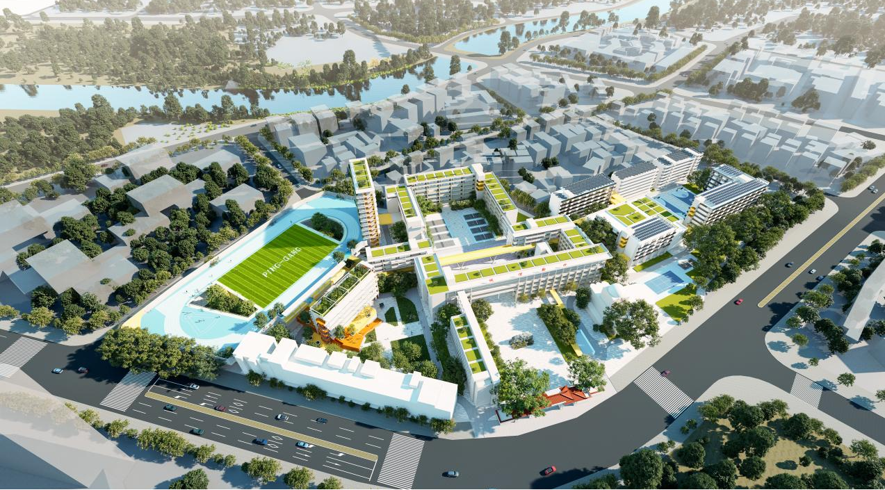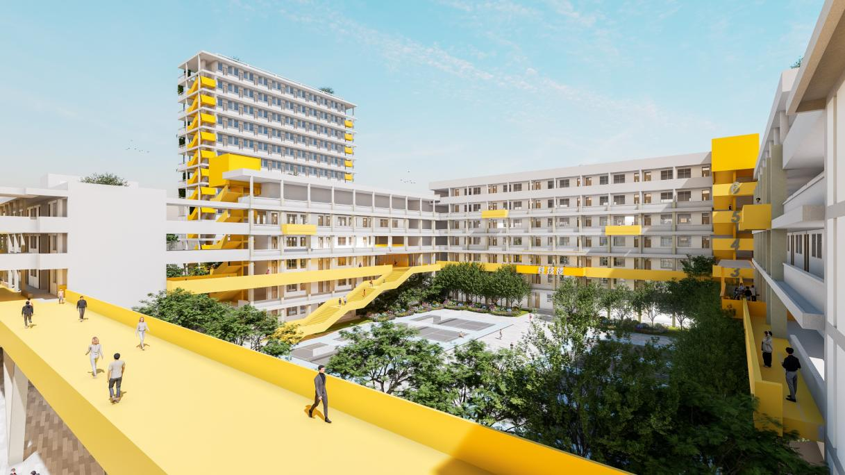 因地处龙岗区“客韵新城”,毗邻龙岗河、龙园公园和鹤湖新居客家民俗博物馆,周边交通发达,生活便利,人口聚集,校园内绿树成荫、设施齐全,拥有良好的打造“绿色校园”“文化校园”的基础。项目组立足校园现状,通过安全评估、院落织补、空间渗透、连桥搭建等设计手法打造多元一体化校园,建成后将为龙岗区师生提供一个安全高效、活力创新的高品质学校。