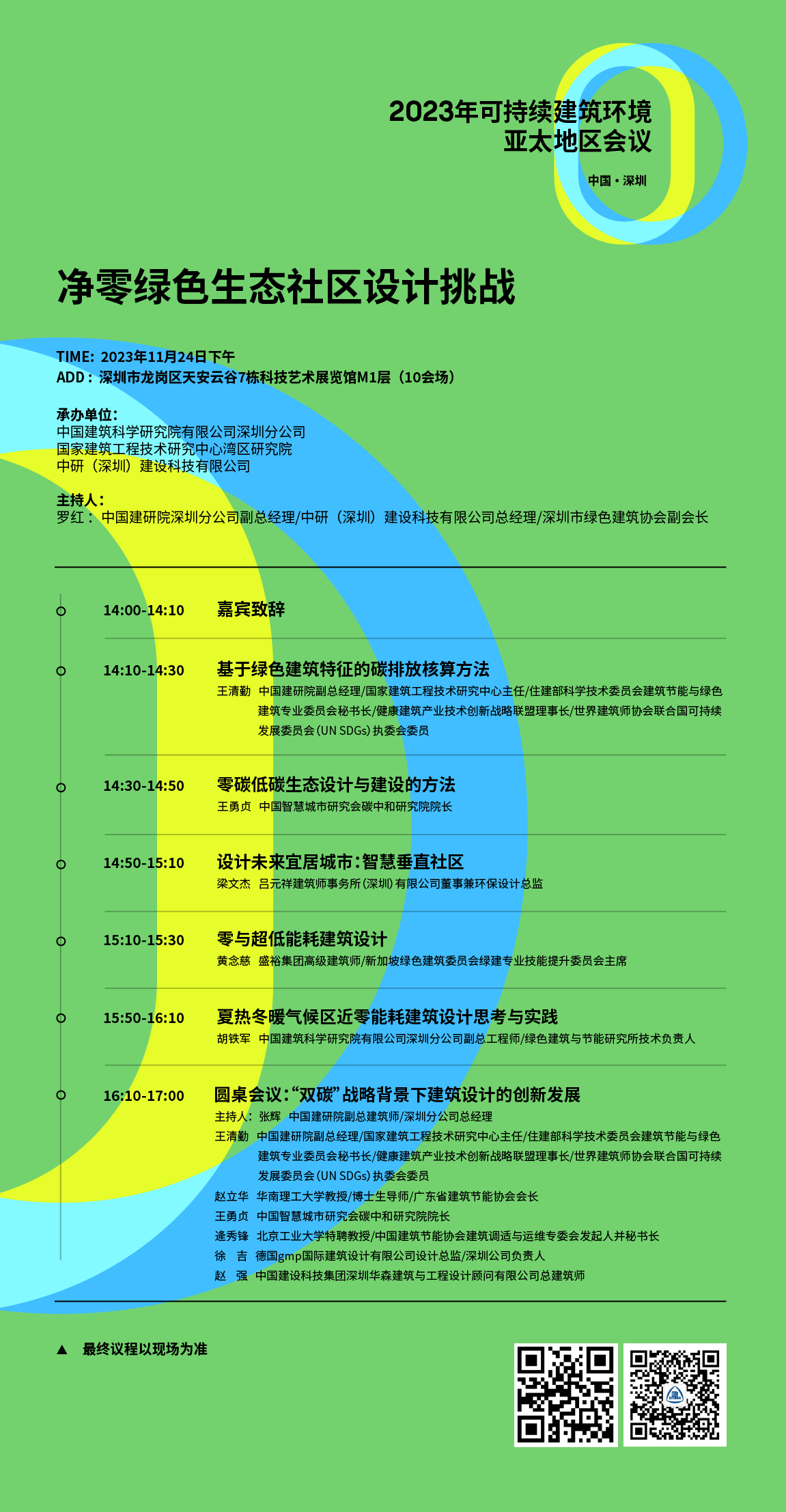 为贯彻落实国家绿色发展理念和“双碳”目标,加快推进建设领域可持续、高质量发展,由深圳市人民政府主办,深圳市住房和建设局、深圳市发展和改革委员会、深圳市龙岗区人民政府共同承办,深圳市绿色建筑协会作为执行单位参与组织的“2023年可持续建筑环境亚太地区会议(SBE23 Asia—Pacific)”将于2023年11月23—24日在深圳龙岗区天安云谷举办。大会联合中国建研院深圳分米乐官方版·(中国)官方网站、国家建筑工程技术研究中心湾区研究院、中研(深圳)建设科技有限米乐官方版·(中国)官方网站,共同发起“净零绿色生态社区设计挑战”主题论坛,诚邀广大业内人士共同参与。