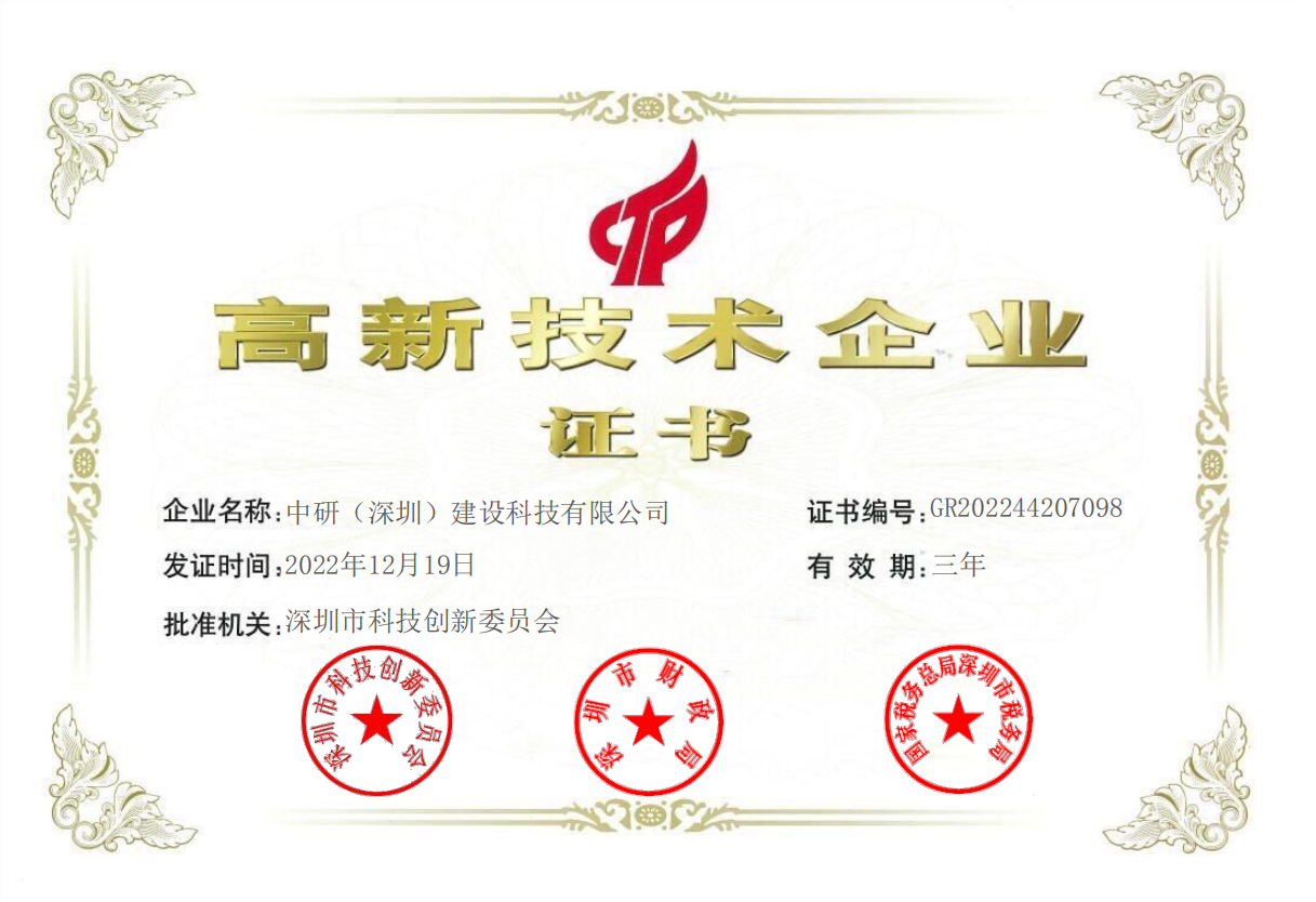日前,中研(深圳)建设科技有限米乐官方版·(中国)官方网站(下称中研科技)顺利通过评审,获得了国家高新技术企业认定证书(证书编号:GR202244207098),由此正式迈入国家高新技术企业行列,开启新篇章。