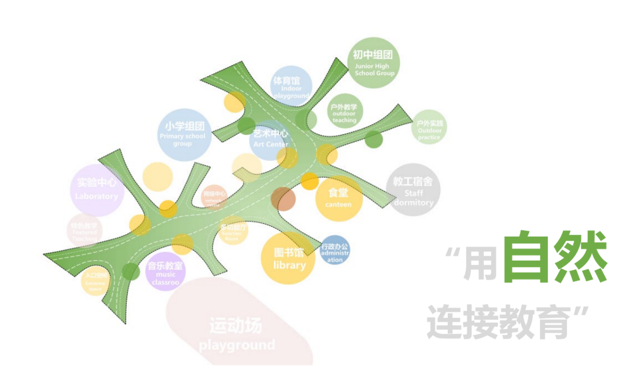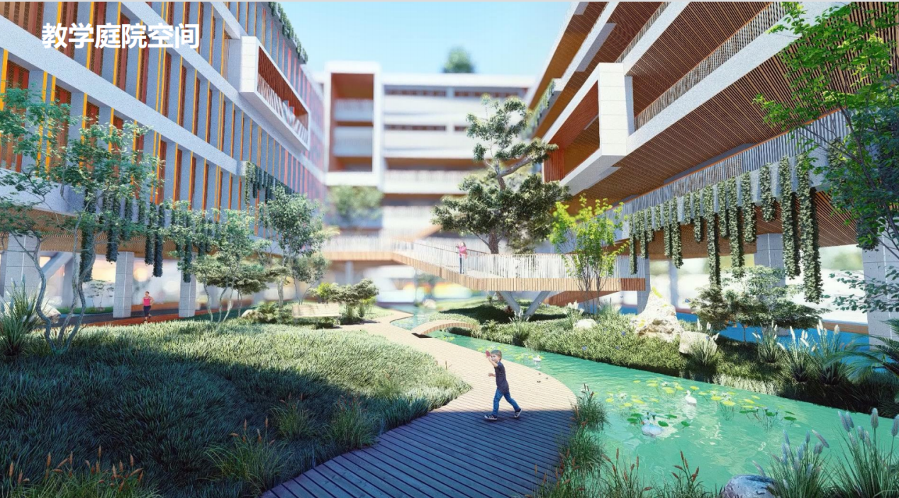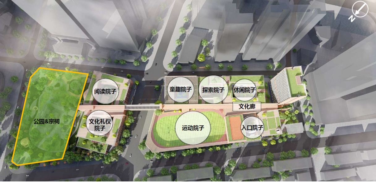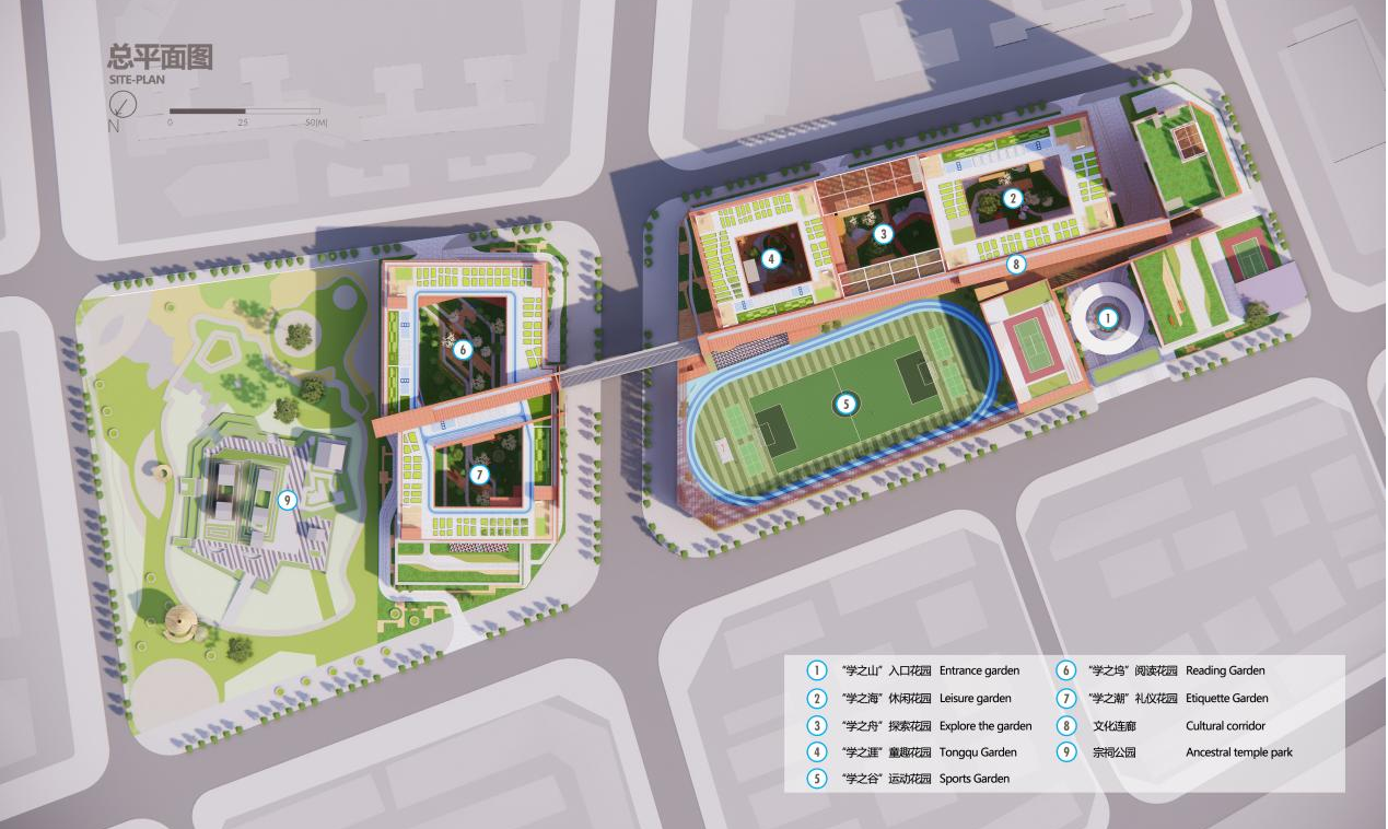 设计秉承 “让每一个学生成为学习的主体”的理念,用一条“文化廊”串联“七个教育院子”, 并与宗祠、公园相连,与周边环境积极互动。在多个设计维度适应未来教育的“校园模式”“社群概念”“成长空间”“复合共享”“绿色生态”“自然艺术”“文体健康”“链接社区”“快速建造”“成本控制”“持续运营”。