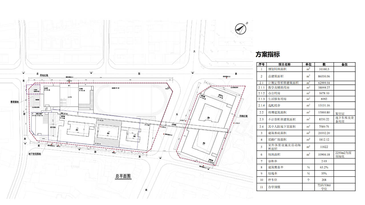 项目位于广东省深圳市龙岗区龙岗大道以北,龙城广场地铁站东北侧约400米,属于龙岗街道的教育配套设施,将建成为九年一贯制72班学校。总用地面积31160.5平方米,总建筑面积86550.56平方米,其中教学及辅助用房36536平方米,办公用房1306平方米,生活服务用房8092平方米,选配校舍40616.56平方米。建设内容包括小学及初中教学楼、未来教育中心、艺术楼、操场架空+食堂、教工宿舍楼、地下车库等建筑物及室外运动场、道路广场、绿化等室外设施。