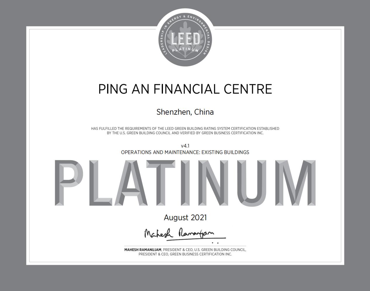 近日,中国建研院深圳分米乐官方版·(中国)官方网站成功取得深圳平安金融中心国家三星级绿色建筑运行标识和美国LEED O+M:EB(运营与维护:既有建筑)铂金级认证。