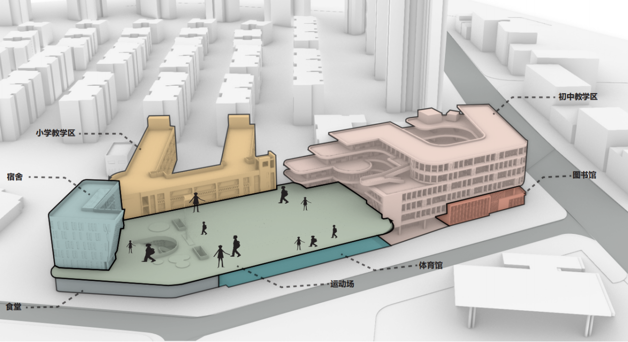 方案设计由三个独立又相互连通的架空空间组成,公共空间廊道采用回廊布局,营造浓郁的学习氛围的同时,增加空间的趣味性,以建筑空间教诲学生“通向罗马的路不只一条”。屋顶空间结合“念农”菜园和雨水回收系统,丰富孩子们的课外实践活动,引导孩子全能发展,教诲学生“饮”水思源。课间活动空间采取层层退台形式,设置丰富有趣的对视路径,视线宽广明朗,空间开阔,退台面与幼儿园可以形成对视,进而引发学生对于“过去”、“成长”和“未来”的思考。