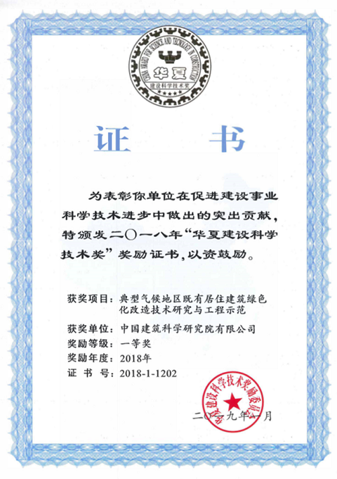 米乐官方版·(中国)官方网站与上海市建筑科学研究院(集团)有限米乐官方版·(中国)官方网站、哈尔滨工业大学共同完成的“十二五”国家科技支撑计划课题《典型气候地区既有居住建筑绿色化改造技术研究与工程示范》荣获2018年华夏建设科学技术奖一等奖。