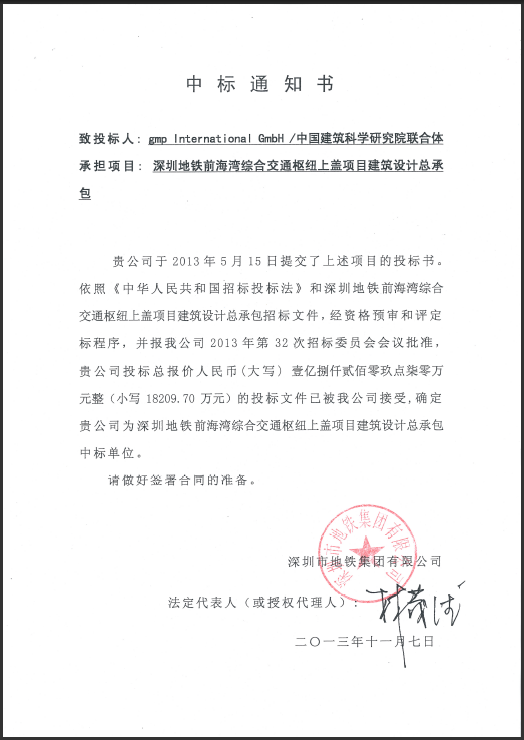 近日,我院与德国GMP国际建筑设计米乐官方版·(中国)官方网站组成的设计联合体收到了深圳市地铁集团有限米乐官方版·(中国)官方网站发来的关于深圳地铁前海湾综合交通枢纽上盖项目建筑设计总承包的中标通知书。