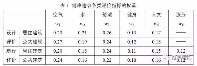 第3.2.7条规定了《标准》中各评价指标的权重。《标准》在各指标权重研究中,以“抓主因、顾次因”的原则充分考虑了不同类型的民用建筑的健康影响因素,并按照民用建筑的分类,建立了居住建筑和公共建筑指标权重的调研问卷,采用问卷调查、层次分析、专家咨询、项目试评等多途径结合的方式,建立了健康建筑各类评价指标的权重,见表1。