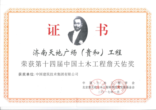 4月14日,第十四届中国土木工程詹天佑奖颁奖大会在北京举行。中技集团建筑设计院设计三所设计的济南天地广场(贵和)项目荣获“第十四届中国土木工程詹天佑奖”。